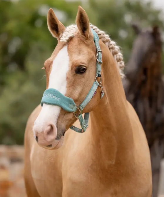 項と鼻部分にフリースパッドがついたあたりのとても柔らかい無口です。 お揃いのリードロープ(1本)が付いています。 鼻まわりと項まわりはサイズ調整ができます。