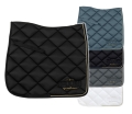 馬の背にフィットするアナトミカルシェイプのゼッケンです。 適度な厚みのフォームが入ったキルティング生地で、吸湿性と速乾性に優れています。 ゴールドの差し色がきれいな刺繍が施された、洗練されたデザインのサドルパッドです。 ベルクロ式のキーパーとガースストラップが付いています。
