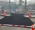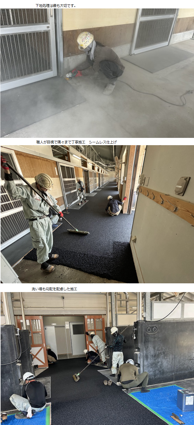 ゴムチップ舗装馬の歩行通路 ウォーキングマシン走路 厩舎内 洗い場等に蹄に優しいゴムチップ舗装が最適です。以前は、剝がれやすくメンテナンスの難しさをよく言われましたが、当社のゴムチップ施工は、引張強度1.3Mpa以上の粘着力で通常の歩道などの約2.6倍の吸着力を発揮します。馬にとっての段差は人間の想像以上に脅威ですので是非シームレス仕上げの安全 安心な環境をお勧めします。