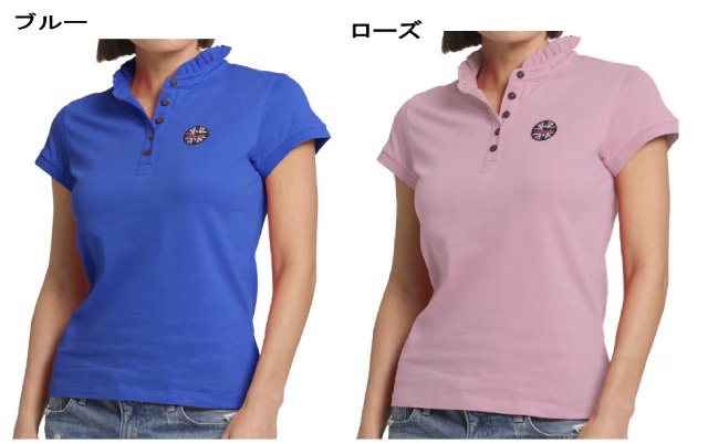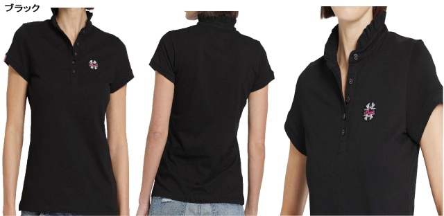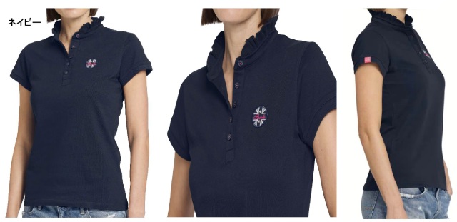 フリル付きの襟元と左胸のロゴパッチが、フェミニンで上品なアクセントを添えます。